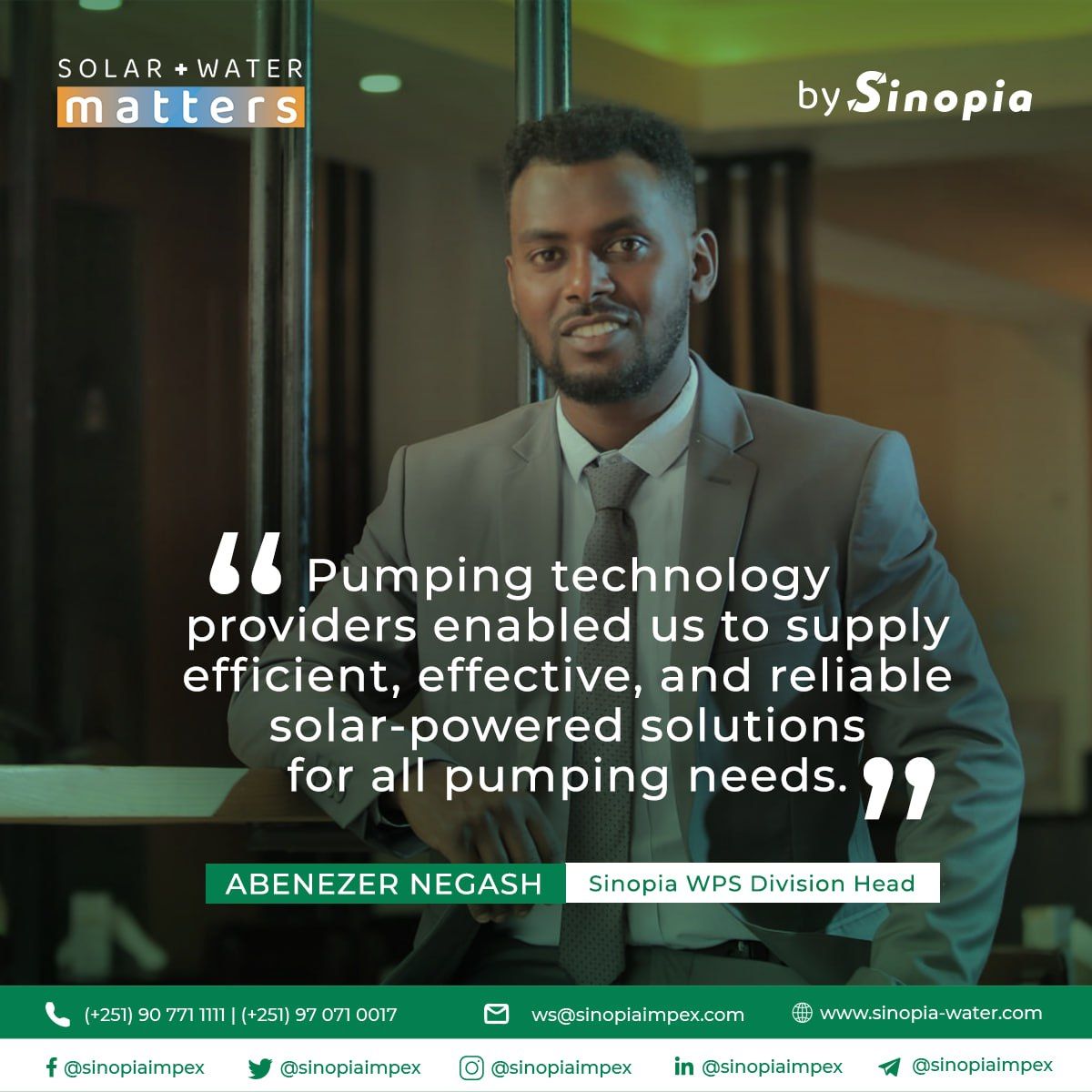 Abenezer: I'd like to thank you as well. I’m Abenezer Negash. I have been working in the solar sector for more than 4 years. And I have been in Sinopia as WPS division head for more than a year. My role in this division is managing projects from the design and consulting stages to the testing and commissioning. Under this Water and Power Solutions (WPS) division, Sinopia supplies a variety of premium-quality pumping systems for both solar water pumping systems and solar electrification, including domestic and submersible water pumps, as well as solar panels, batteries, controllers, and solar-powered pumping systems. The division supplies versatile solar-powered water pumping solutions along with in-depth pre and post-sales services and has proven its capability by successfully implementing different water and solar projects throughout Ethiopia.